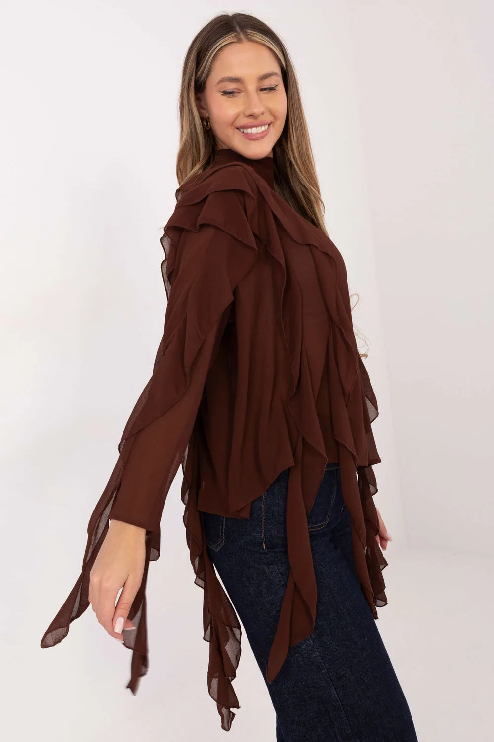 An elegant women's blouse is a perfect choice for everyday wear, special occasions, and parties when you want to emphasize your style with a subtle yet striking form. Its smooth pattern gives the whole a touch of class and makes it easy to pair it with both elegant trousers and a skirt. The model is made of a pleasant to the touch blend of viscose and polyester, making the blouse soft, slightly elastic, and beautifully draping on the silhouette. The standard length and long sleeves make the blouse look elegant and versatile. The turtleneck emphasizes the neck and adds a touch of chic mystery, while the button closure at the neck makes it easy to put on and serves as a delicate decorative accent. The blouse also enchants with unique details, decorative ruffles on the back, front, and sleeves, which give it lightness, a romantic character, and fashionable elegance. It is an excellent choice for women who like to combine subtle classic with striking, feminine finishes.