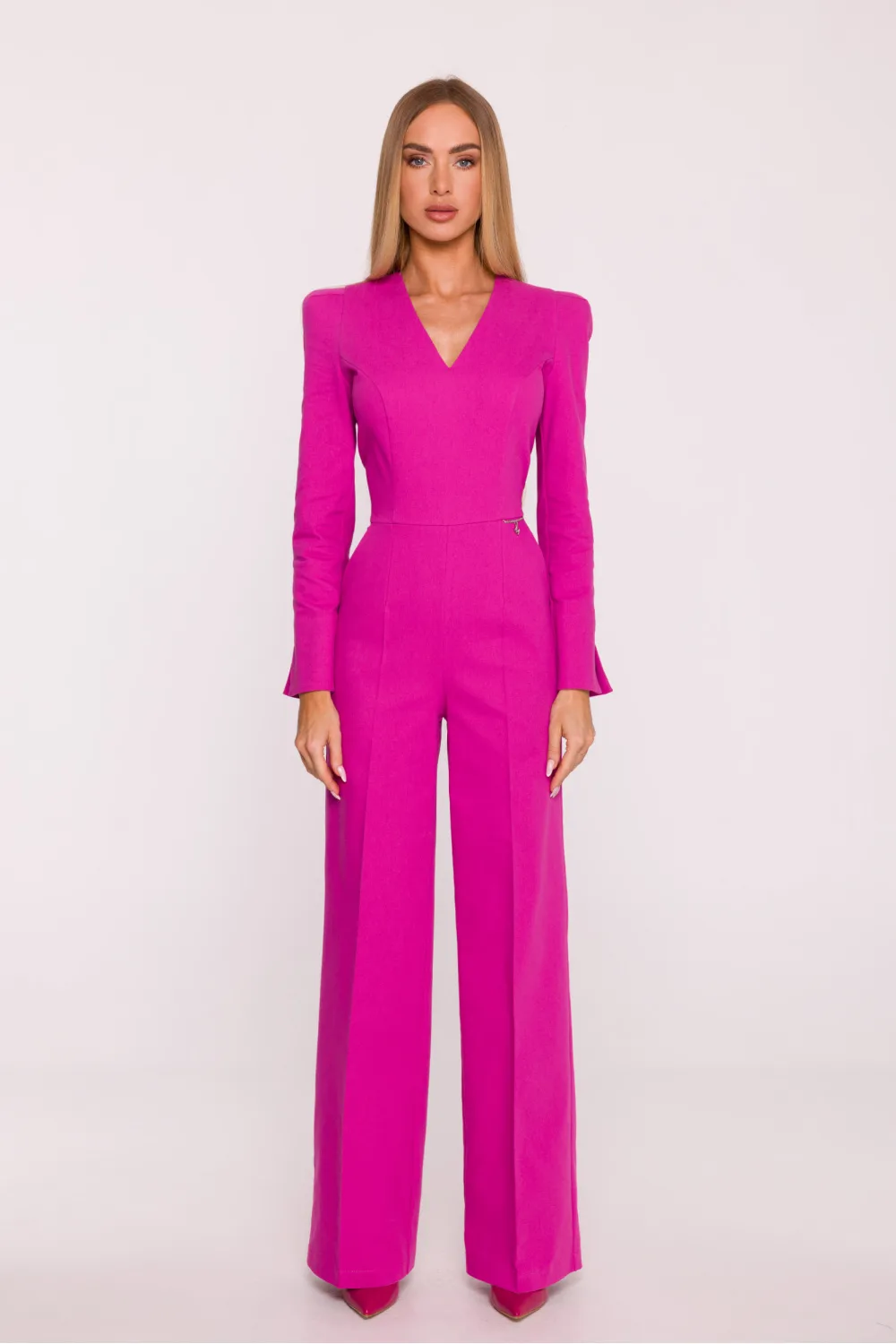 An elegant jumpsuit made of denim-like fabric is a unique proposal combining modern style with a classic form. Slightly stiff, matte, and slightly elastic fabric beautifully holds the shape, while the lining ensures comfort and impeccable overall fit. The model features a V-neckline, which subtly slims the neck and adds lightness to the silhouette. Long sleeves with a delicate flare at the cuffs introduce an elegant, refined accent. The concealed zipper closure at the back gives the whole a coherent and neat look. The top of the jumpsuit has a clearly defined, structural line of shoulders and a fitted waist, further highlighted by a metal logo chain. Wide palazzo-style trousers reaching the floor visually elongate the silhouette and give it balanced, slim proportions. Designed and made in Poland, created for women who appreciate modern elegance, comfort, and perfect finishing in every detail.