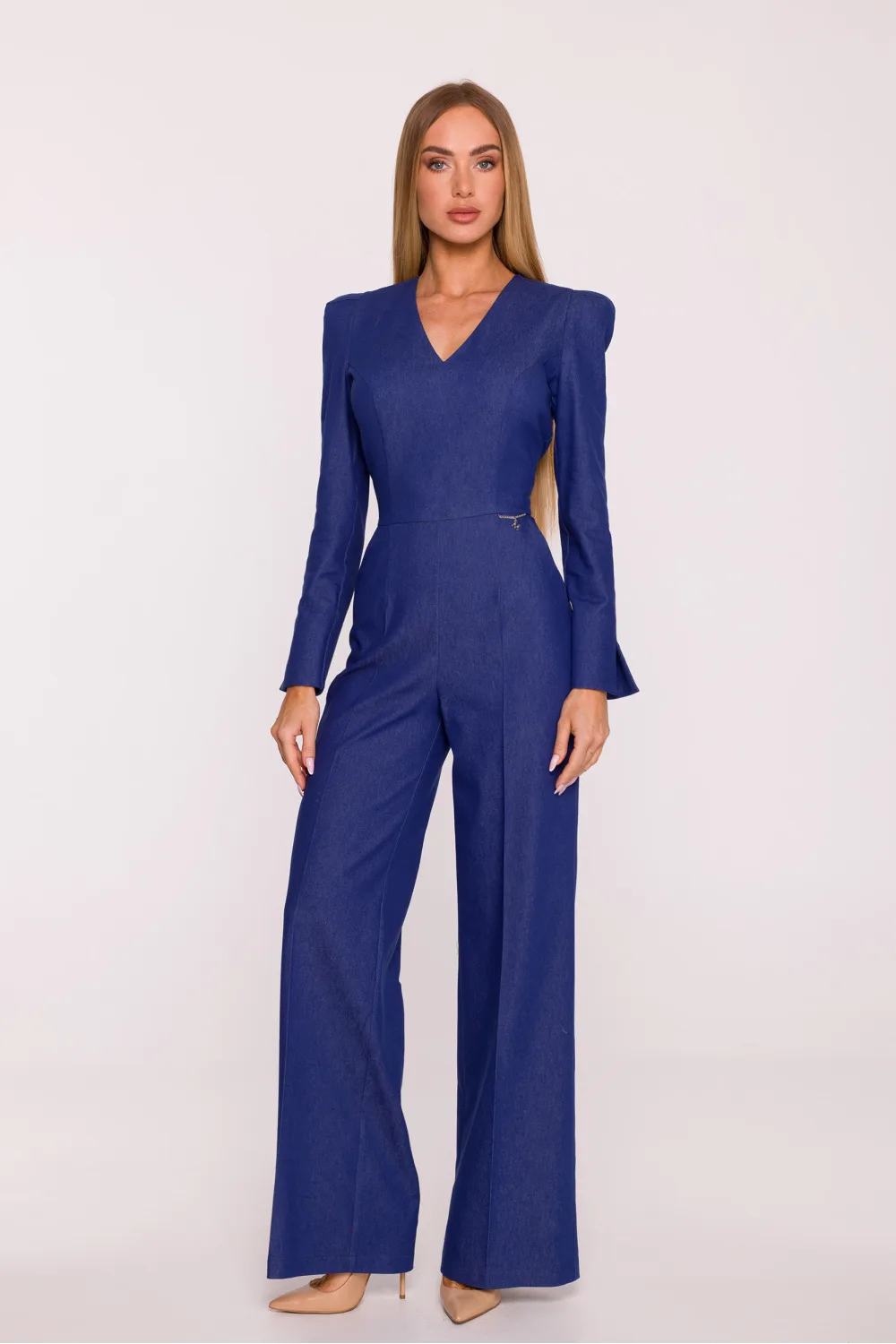 An elegant jumpsuit made of denim-like fabric is a unique proposal combining modern style with classic form. Slightly stiff, matte, and slightly elastic fabric beautifully holds the shape, and the lining (95% polyester, 5% elastane) ensures comfort and impeccable overall fit. The model stands out with a V-neckline, which subtly slims the neck and adds lightness to the silhouette. Long sleeves with a delicate flare at the cuff introduce an elegant, refined accent. The concealed zip closure at the back makes the whole look coherent and neat. The top of the jumpsuit has a clearly defined, structural shoulder line and a fitted waist, further emphasized by a metal logo chain. Wide palazzo-style trousers reaching the ground visually lengthen the silhouette and give it balanced, slim proportions. Designed and made in Poland, created for women who appreciate modern elegance, comfort, and perfect finishing in every detail.